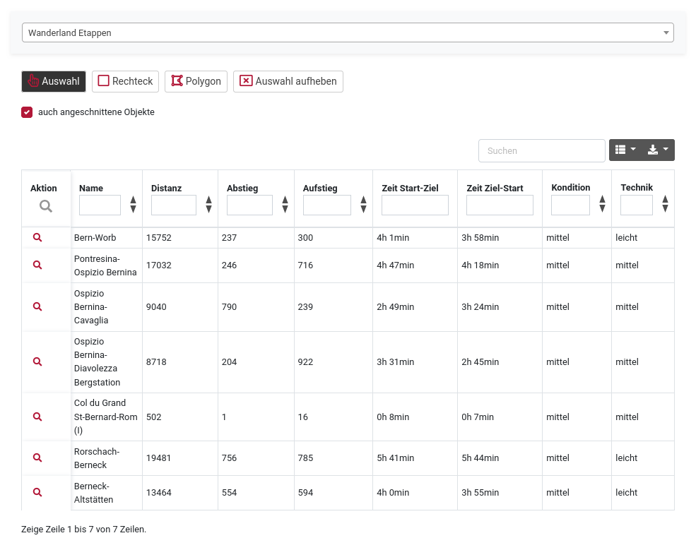 Besipiel Kombination mit Auswahlfelder: Distanz <4000 und Kondition leicht und Technik leicht; oder für die Herausforderung: Distanz > 10000, Kondition schwer und Technik schwer